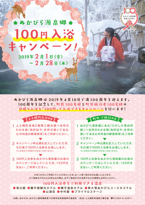 2019年4月10日で満100周年になる、上士幌町ぬかびら源泉郷!源泉かけ流しの温泉は、体をぽかぽか温めまあう!そんなぬかびら源泉郷にてお得なキャンペーンを、2月1日~28日に行います。