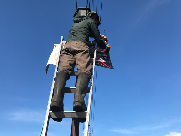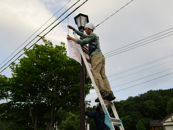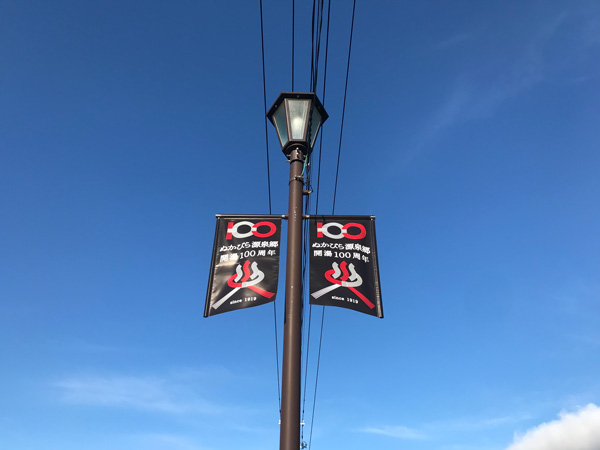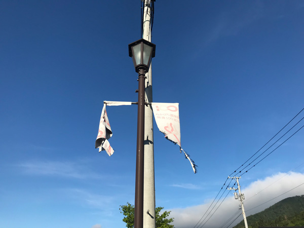 - 昨年設置した街灯フラッグ。皆様をお迎えすべく温泉街をはためいておりましたが、、、