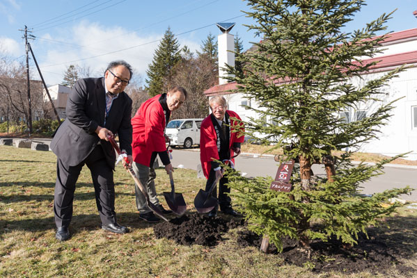 記念植樹 この先100年の繁栄を願って赤蝦夷松を植えました。