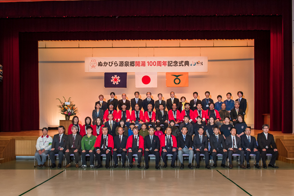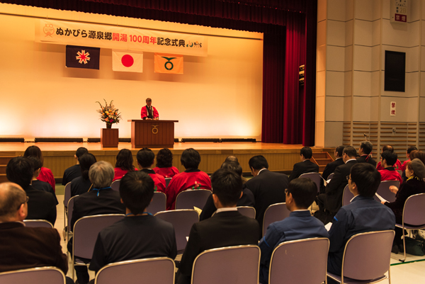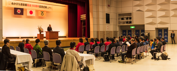 満100年を祝して温泉街の文化ホールにて記念式典を開催いたしました。